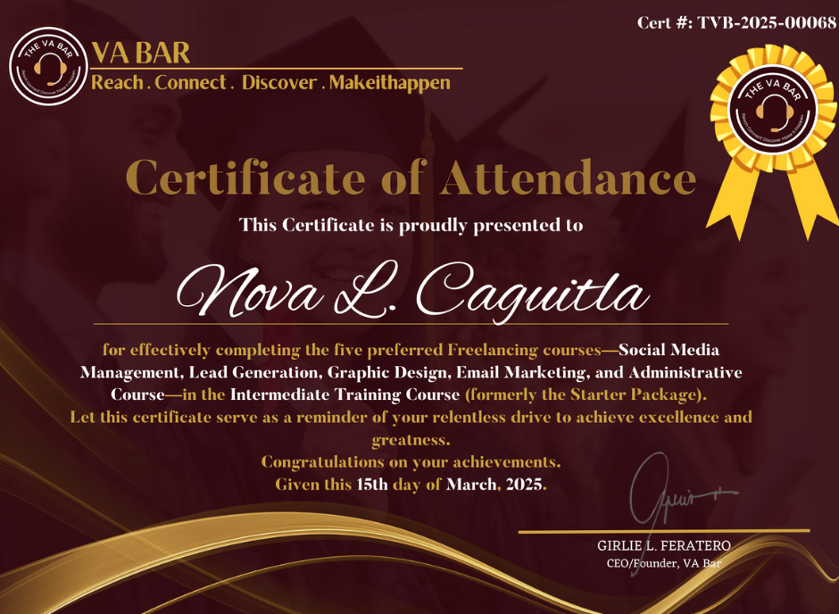 VA Bar Certificate of Attendance – Social Media Management, Lead Generation, Graphic Design, Email Marketing, and Administrative Course (Mar 2025)