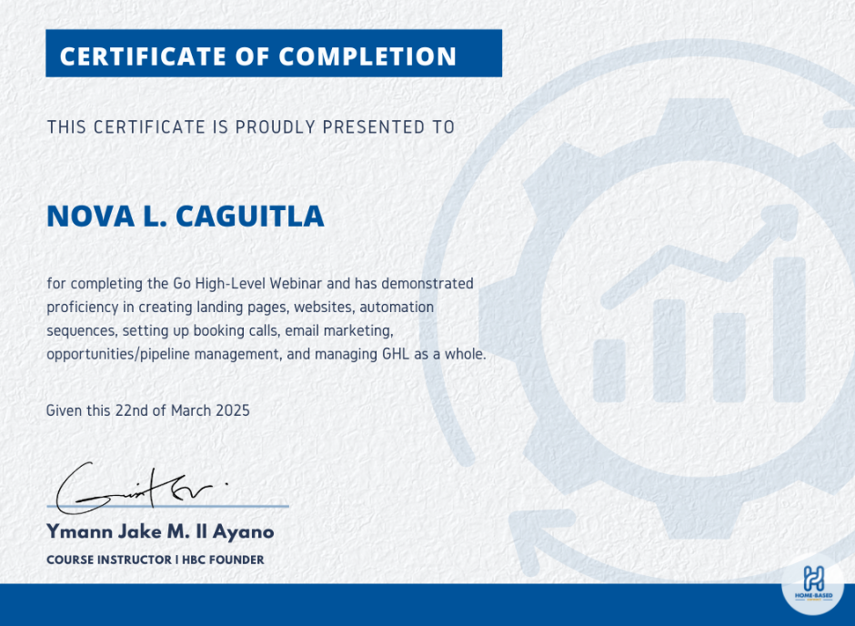 GoHighLevel Proficiency – Completed training in landing pages, websites, automation workflows, booking systems, pipeline management, email marketing, funnel creation and membership site setup (Mar 2025)